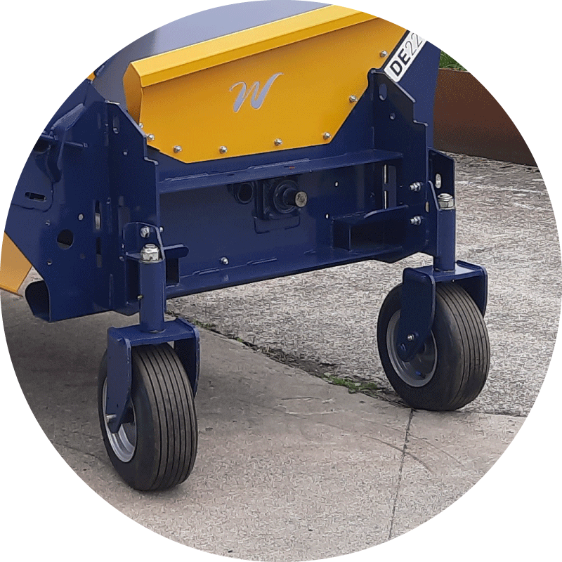 L’ajout de 2 roues pivotantes permet d’utiliser la dérouleuse avec des chargeurs d’une faible capacité de levage (de 500 à 1500kg).